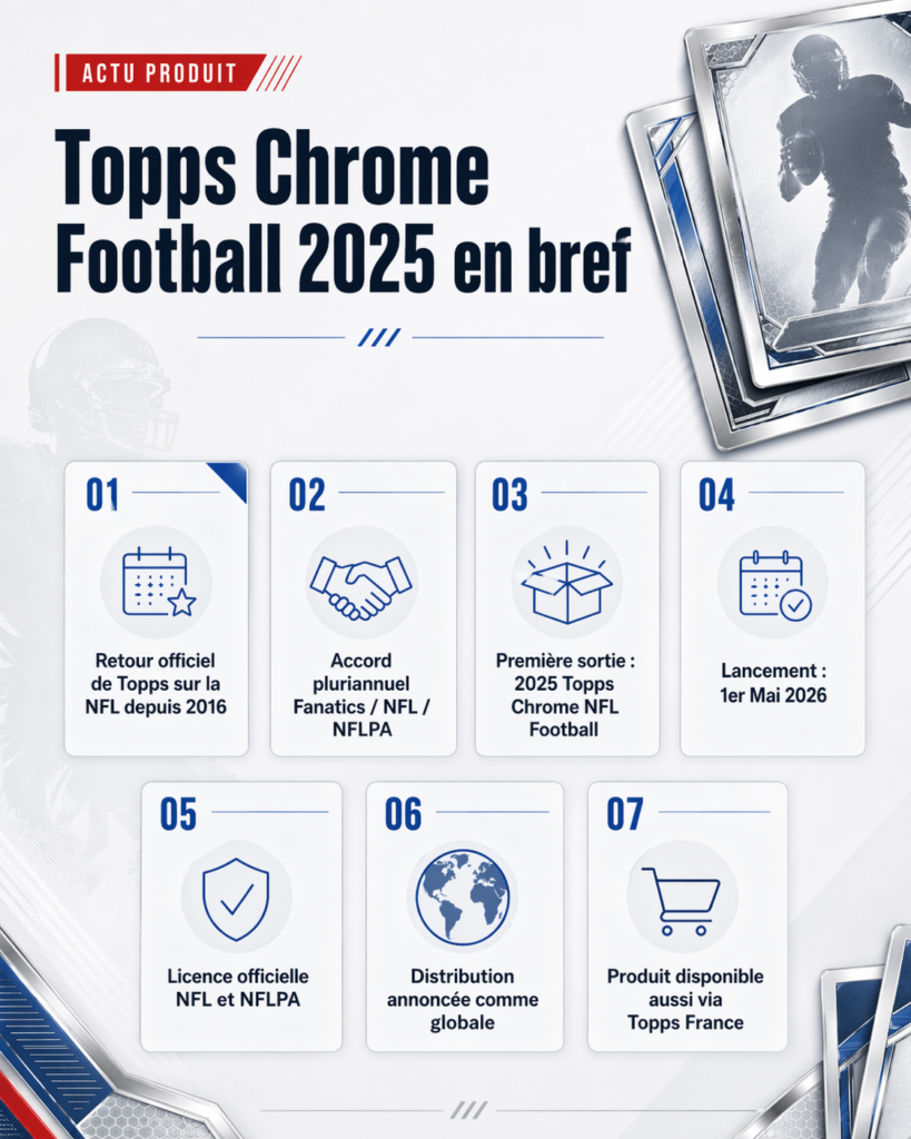 Pour la première fois depuis 2016, Topps revient officiellement sur les cartes NFL licenciées. Avec Topps Chrome Football 2025, Fanatics ne signe pas seulement un retour attendu : il pose les bases d’un nouveau marché mondial de la carte de football américain.