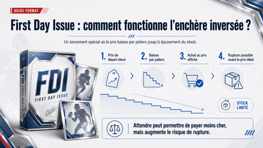 Autre nouveauté stratégique : le format First Day Issue, ou FDI. Topps le commercialise via une Reverse Dutch Auction, une mécanique encore peu familière pour une partie du public français.