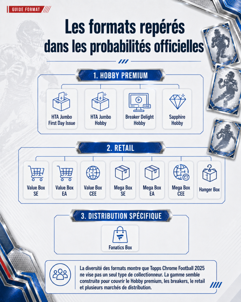 Les probabilités officielles publiées pour 2025 Topps Chrome Football révèlent de nombreux formats : HTA Jumbo First Day Issue, HTA Jumbo Hobby, Breaker Delight Hobby, Sapphire Hobby, Value Box, Mega Box, Hanger Box et Fanatics Box. On voit aussi apparaître des déclinaisons SE, EA et CEE, notamment pour les Value Box et Mega Box.